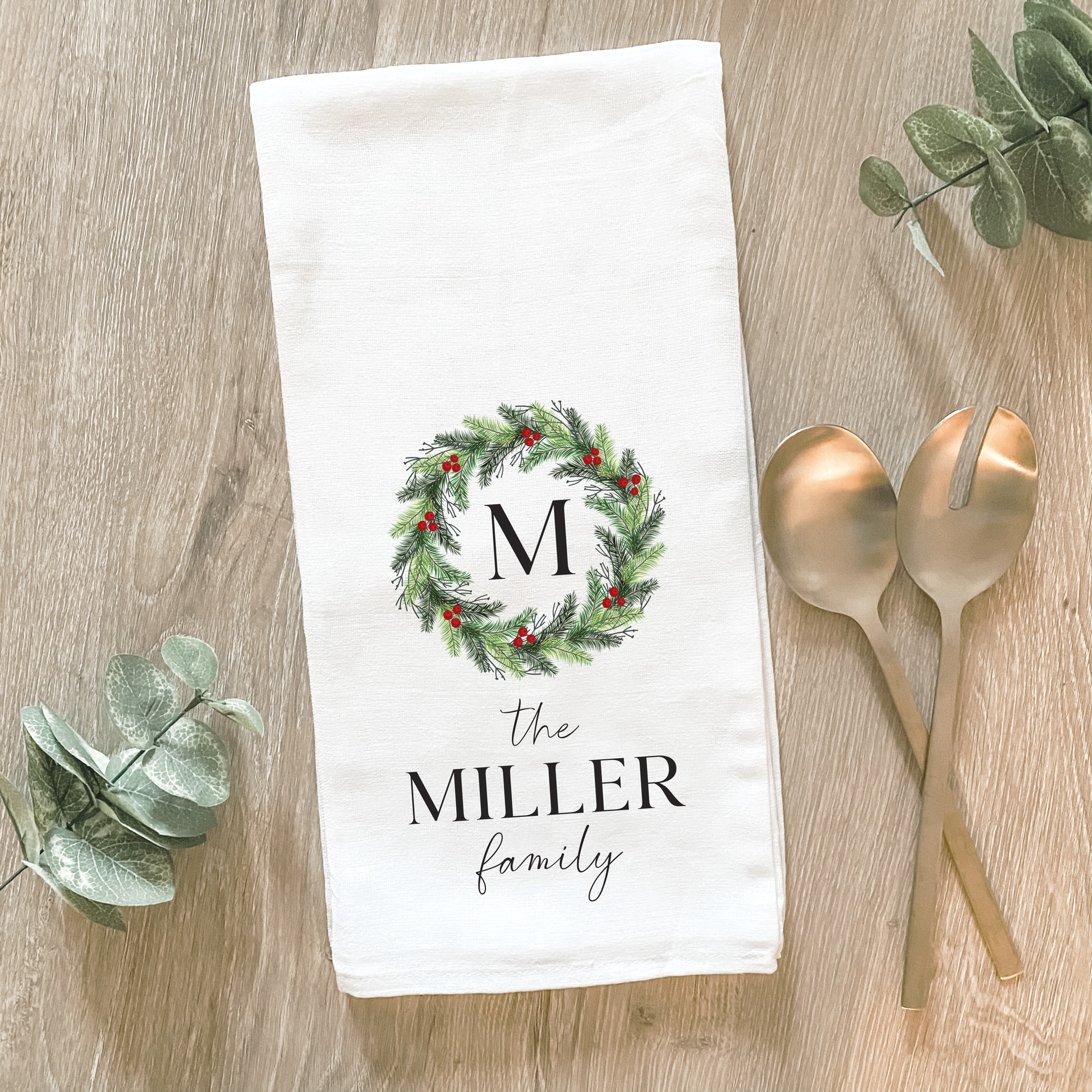 Custom Initial & Last Name Holiday Wreath - Cotton Tea Towel